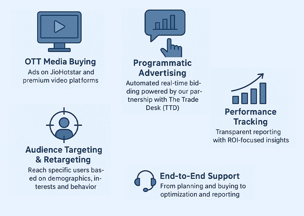 - ✅ OTT Media Buying – Ads on JioHotstar and premium video platforms.